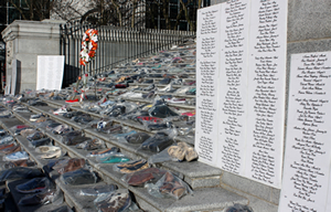 The Shoe Memorial honours the memory of murdered women with a powerful visual display of a set of shoes for each victim placed on the steps of the Vancouver Art Gallery, with their names displayed.