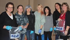 The UFCW Local 247 Women's Committee bagging up shoes for the December 6 Shoe Memorial in Vancouver. Pictured L-R are Kathleen Allen, Sandra Peters, Cathy Maw, Dawn Stevenson, Tima Dickerson, Ximena Mastrodonato, and Cathy Shannon.
