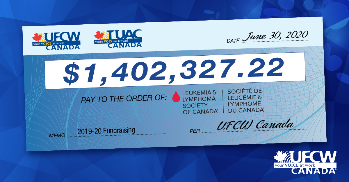 Members and Locals of Canada’s neighbourhood union, UFCW Canada, have raised more than $1.4 million dollars in their latest annual campaign to support the lifesaving and lifechanging work of the Leukemia & Lymphoma Society of Canada (LLSC). Since adopting the LLSC as their charity of choice in 1985, the UFCW family of members, Local Unions, and activists have now raised over $45.1 in support of the LLSC.