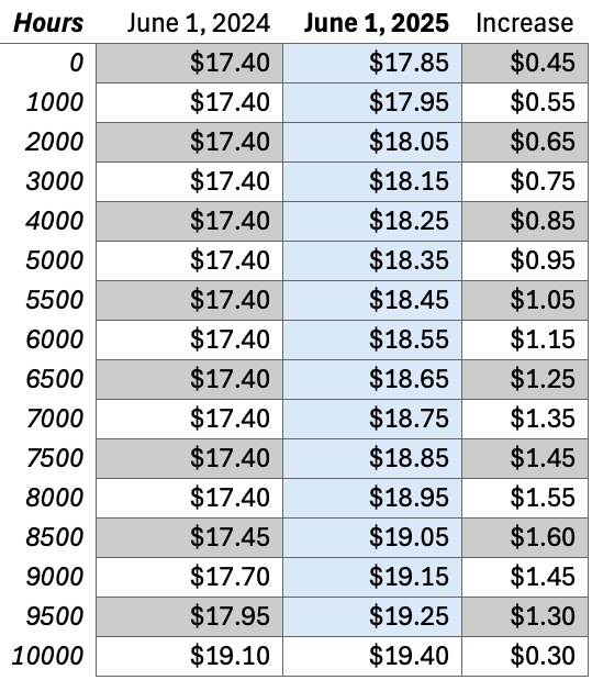 Move to the next column to see what your rate of pay will be as of June 1, 2025. If your rate is blue, then it has been affected by the Minimum Wage Adjustment. For example, a food clerk with 8200 hours would be earning $17.40 now, but on June 1 will be earning $18.95. Once they reach 8500 hours, they will receive $19.05.